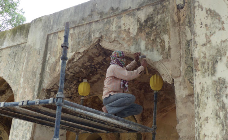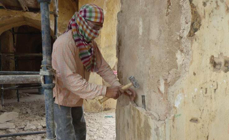 Major alterations and inappropriate 20th-century repairs had obscured the Hammam’s grandeur. Conservation efforts began with removing unsuitable modern cement repairs. Dismantling loose plaster, cement, and distemper revealed original plaster layers with grooves and arch bands. Several sealed openings were reopened, revealing niches for lamps and doorways, restoring the monument's original extent and façade. This also allowed more light to enter, making the previously dark space more inviting. The internal surface, severely damaged by water seepage, was replastered with lime mortar to match the original details and mouldings.