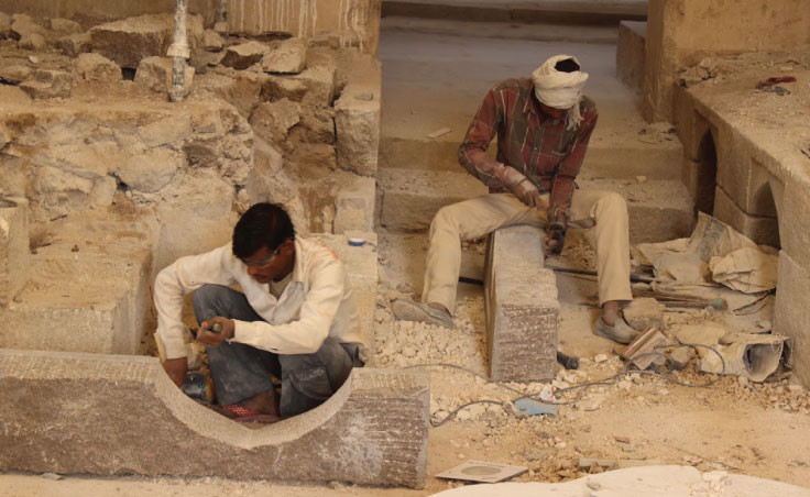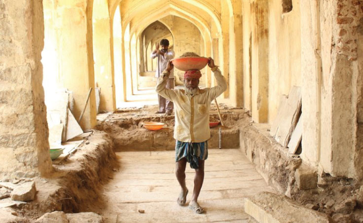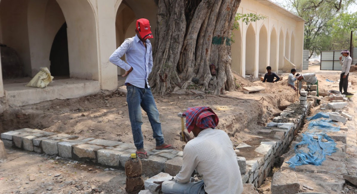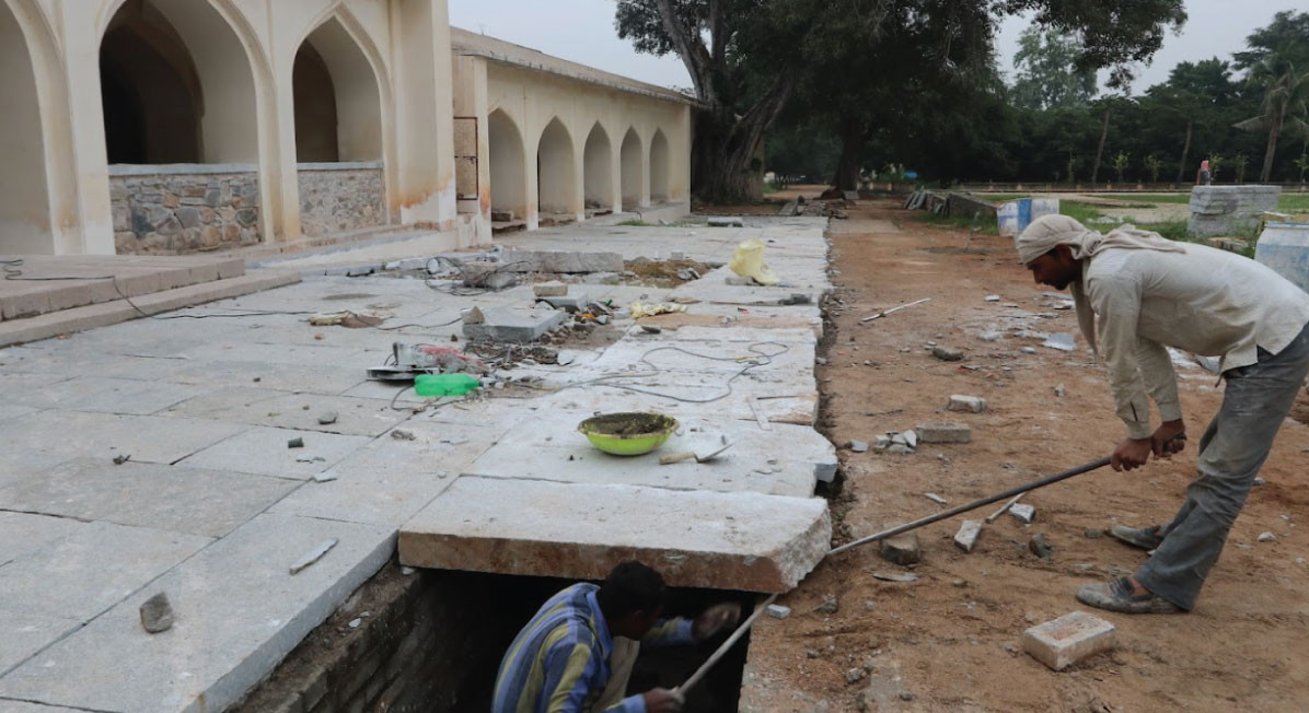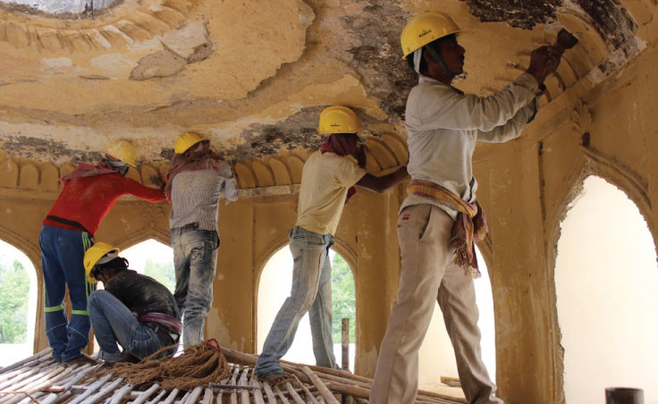 Missing or damaged stone elements in the internal chamber were carefully restored by skilled craftsmen, with hand-chiselled stone matching the original evidence in shape, color, and texture. Vegetation clearance and archival photographs revealed a link between the Hammam and the baoli/stepwell to its north, indicating a higher water-lifting mechanism in the late 19th century. Removal of 150 tonnes of cement concrete from the roof uncovered a network of terracotta pipes supplying water to ground-level cisterns. The roof was re-laid with 6-inch thick lime concrete, ensuring adequate slope and preserving the terracotta pipes. The original hexagonal profiles of roof openings were restored with stone edging before applying lime concrete.