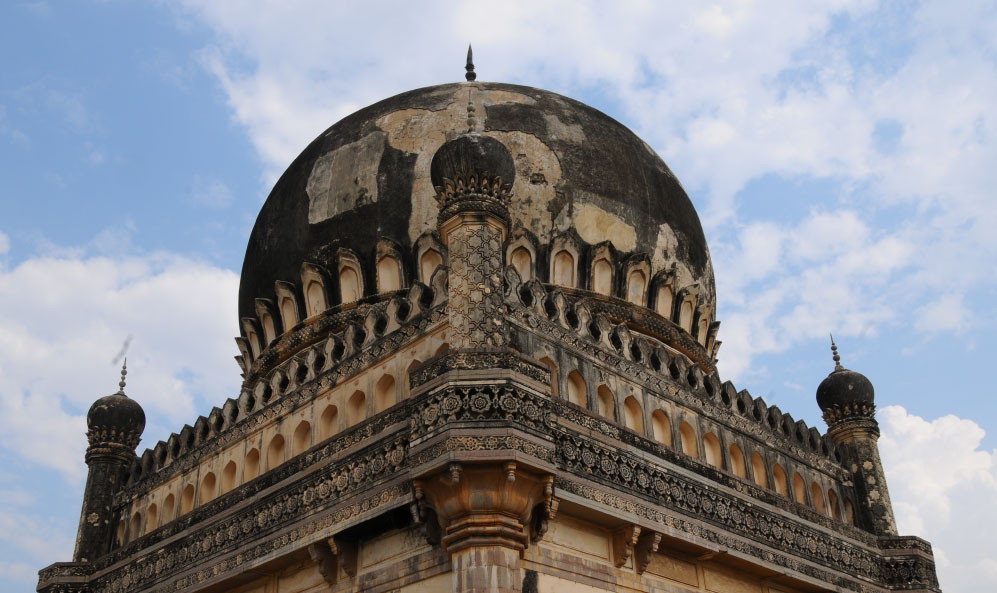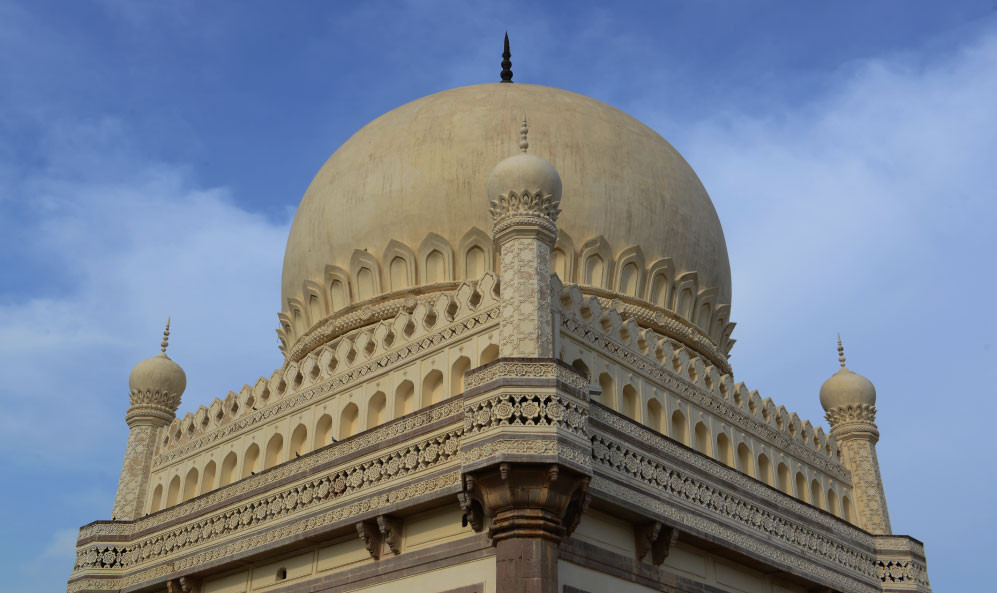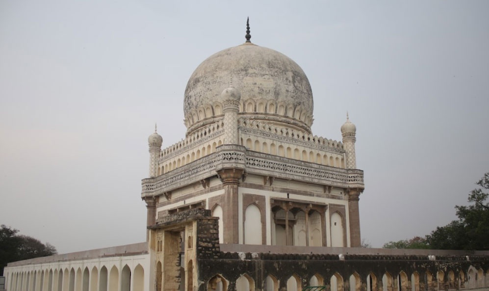 Built during Muhammad Quli Qutb Shah's reign, his majestic tomb stands as one of the largest structures in the Qutb Shahi Heritage Park. The tomb is built on a raised vaulted base, which houses Sultan's original grave, which is the only one accessible amongst all the Qutb Shahi imperial tombs. The upper terrace features a recessed bay in the center on each of its four sides, and each of these bays are supported by two massive granite pillars, standing at an impressive 7 meters tall. Brackets four sides, like Charminar, which was also built by Sultan Muhammad Quli. The bulbous dome sits majestically and looms large over the surrounding area.