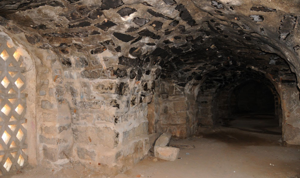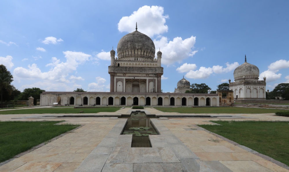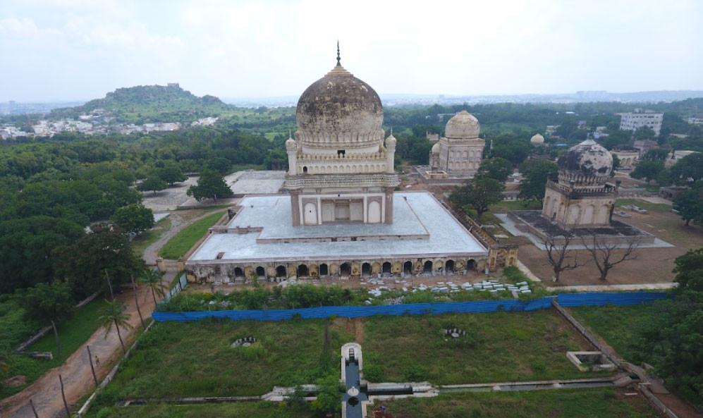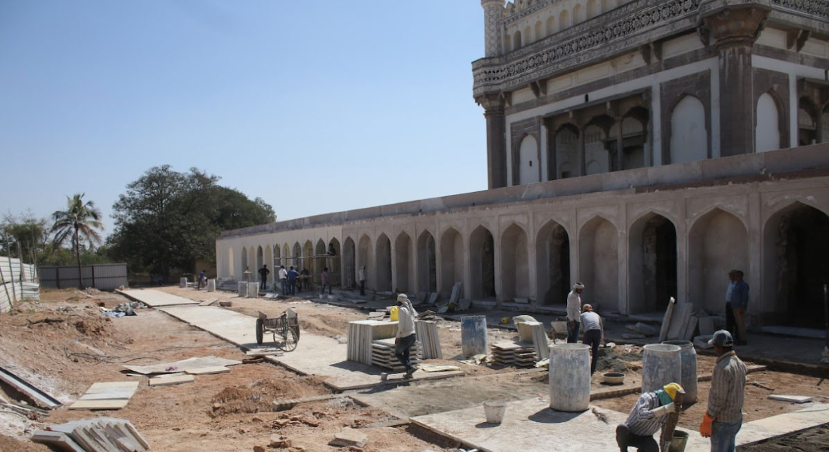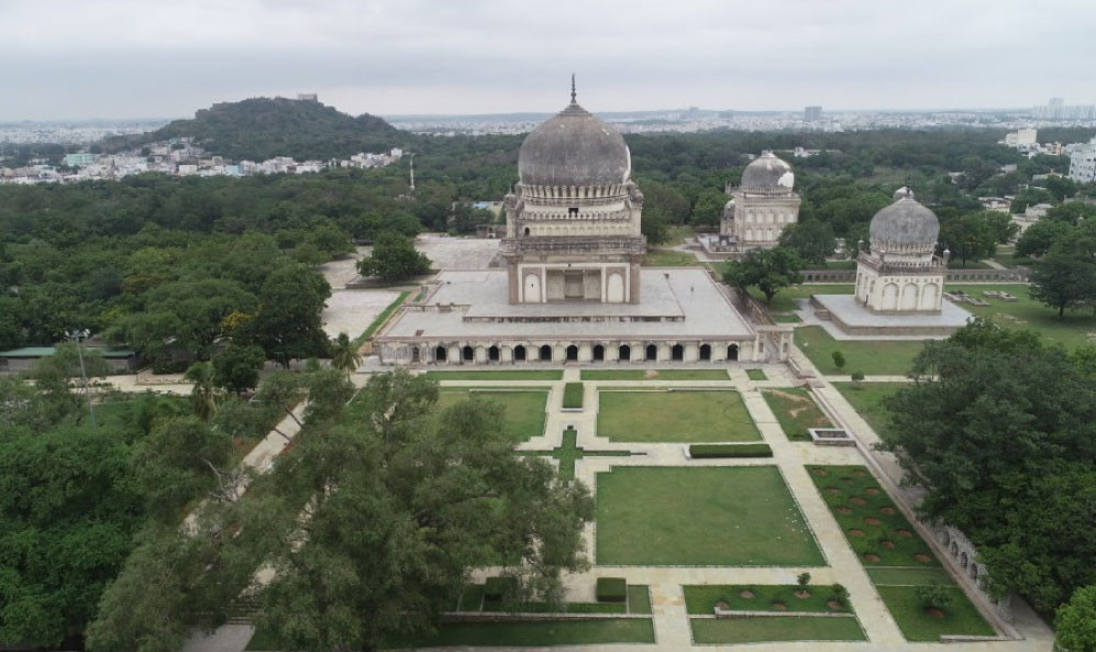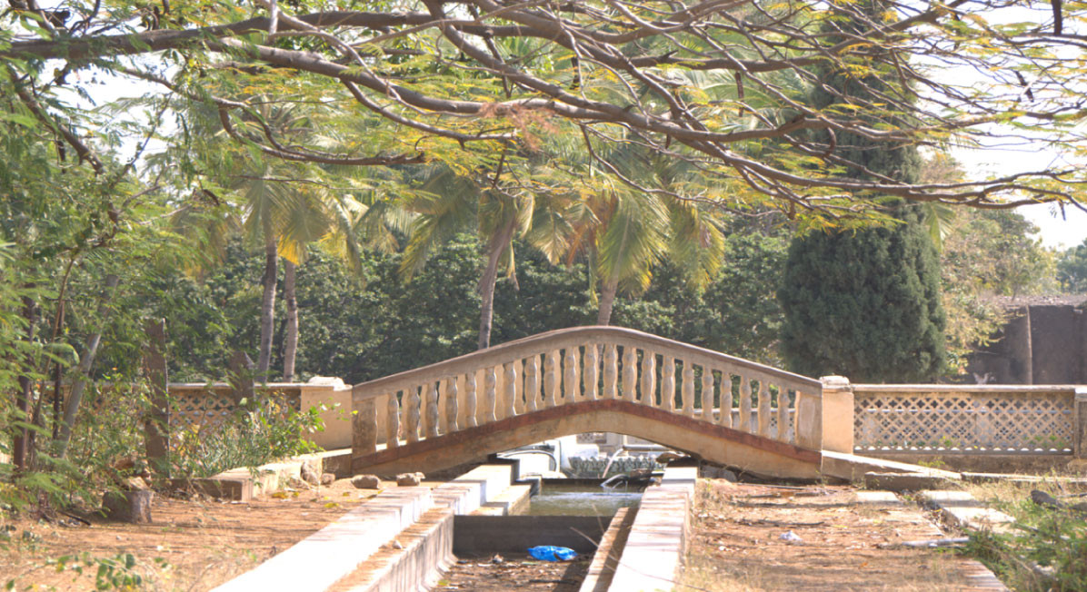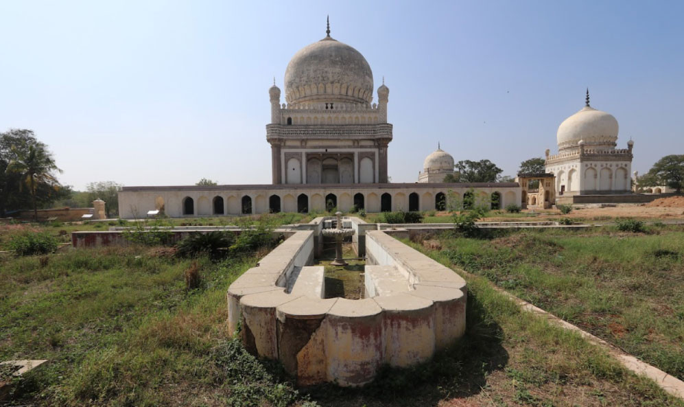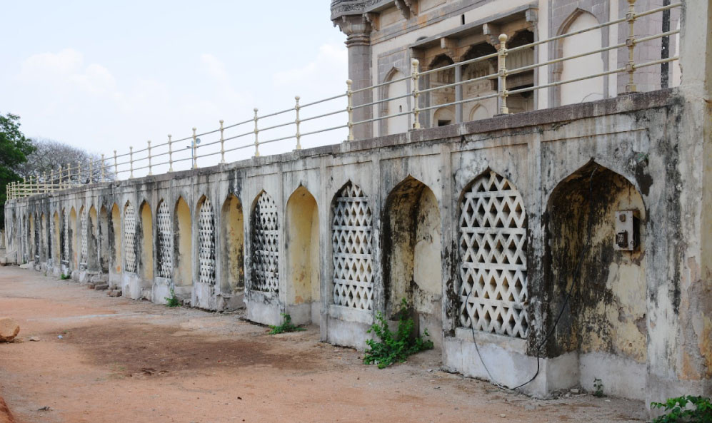 The majestic tomb of Muhammad Quli Qutb Shah was set amidst sprawling gardens consisting of stone pillars to support vine tendrils and foliage. The garden was largely altered with late 20th century additions such as water fountains, cement concrete railings, Japanese style bridge, lampposts and shallow water channels.