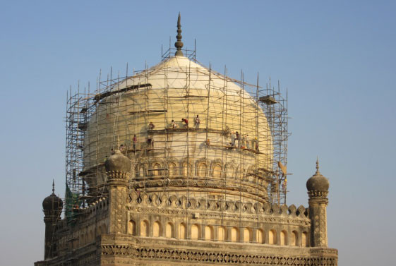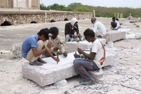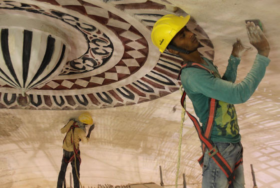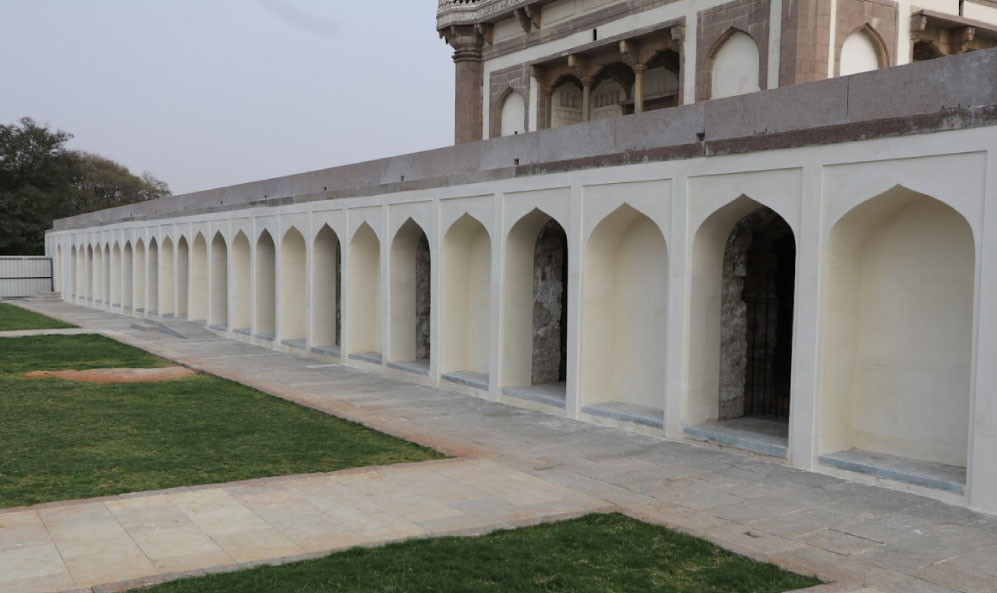 Conservation works on this monument majorly involved removal of cement, replacing it with traditional lime mortar. The character of the building was further accentuated by reinstatement of the missing granite parapet across the plinth of the mausoleum with hand chiseled dressed stones